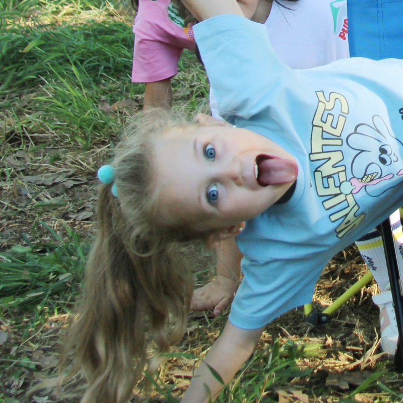Puede estar cabeza abajo y aún así ser la más divertida del grupo. Maestra de poses locas, risas espontáneas y abrazos sin aviso. Dicen que no para... y tienen razón