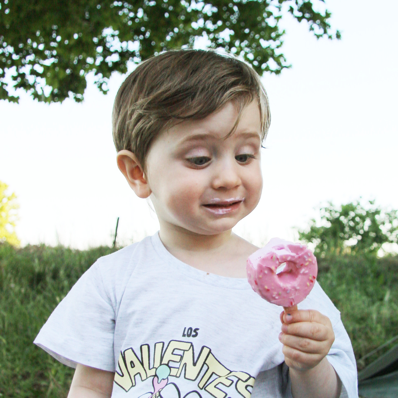 Con una camiseta que dice "Valiente" y un helado donut en la mano, no necesita más. Bruno es la prueba de que la infancia sabe a azúcar, risa... y un poquito de caos bonito.